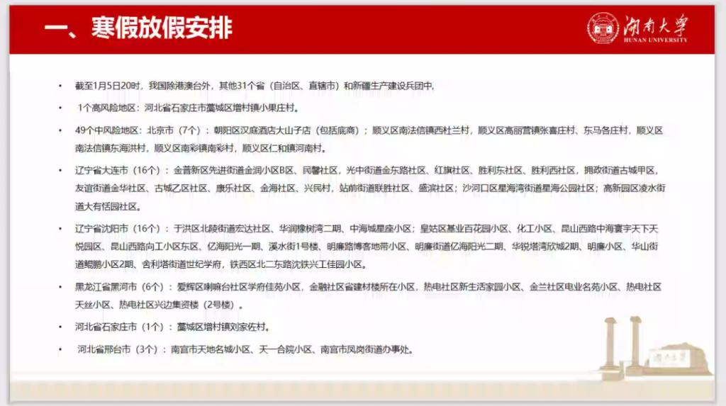 会议中,伍老师表示,为了保障学生安全,且考虑到近期各地疫情反弹情况,目前家乡为中高风险地区的同学可以不急于回家,学工部已在制订更为详尽的工作方案,有关寒假的具体安排一旦有所调整,玩偶姐姐