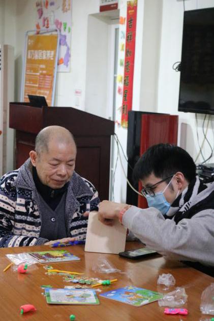 (志愿者与老人一起完成软陶泥手工制作)