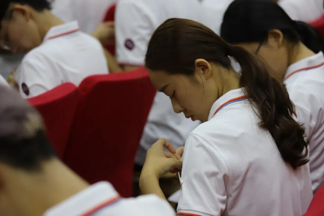 第三阶段,校徽佩戴仪式。会上,各班班助给新生发放了校徽。新生们收到校徽后,郑重地佩戴在右胸,表情认真严肃。在带上校徽的那一刻,他们就真正成了玩偶姐姐