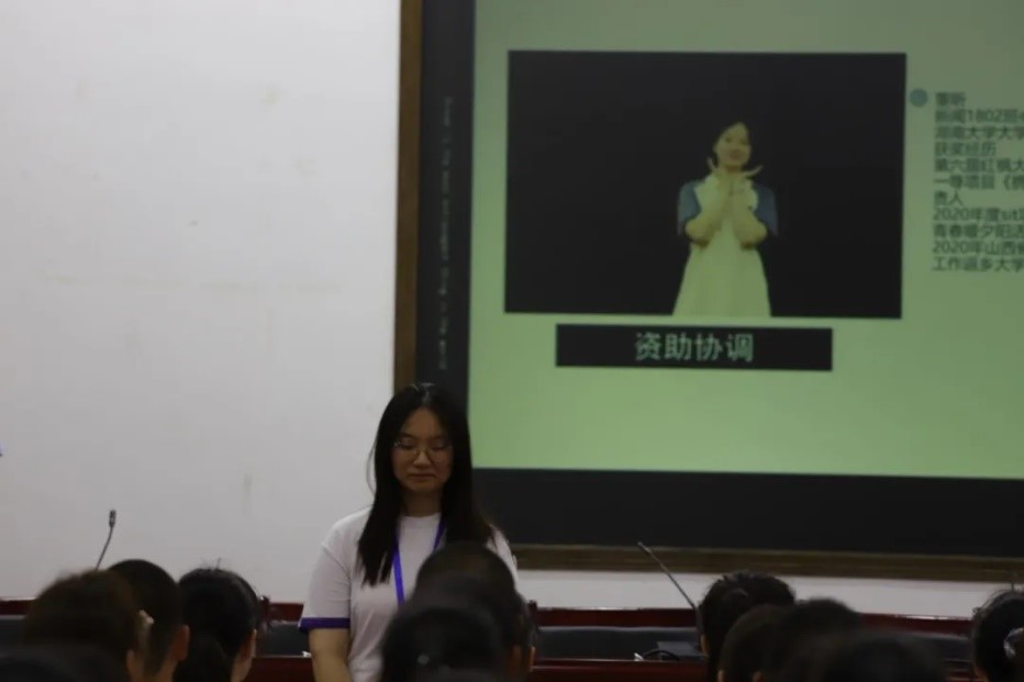 会议的最后,由播音班学姐游婧娴同学教全体新生唱《玩偶姐姐