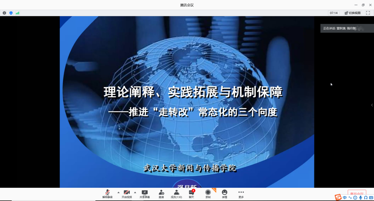 “走转改”指新闻工作者在进行新闻实践活动时需要“走基层、转作风、改文风”。强教授通过引用习近平总书记关于“走转改”的讲话,指出“走转改”是党的群众观点、群众路线的体现,既在当下具有现实必要性,也是加强马克思主义新闻观教育的具体方式和抓手。对此,强教授从理论阐述、实践拓展、机制保障三个向度对“走转改”活动进行了深度讲解。