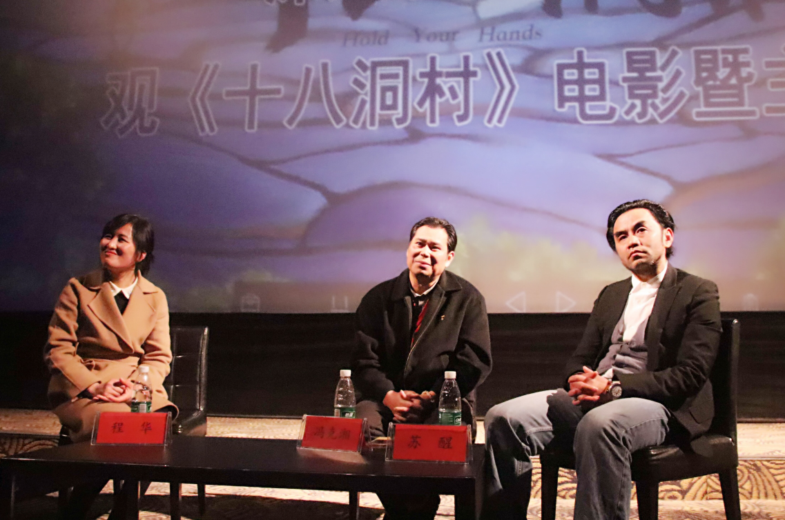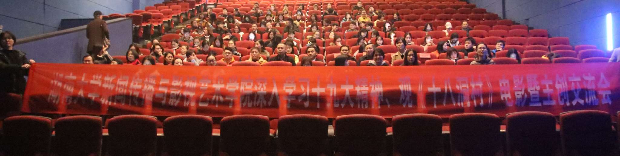 红色的横幅“深入学习十九大精神,观《十八洞村》电影暨主创交流会”,展示了此次