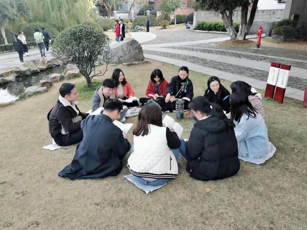 第十组组员则在小组研讨活动的当天,带着自己研读的红色书籍共同前往岳麓书院举行读书会活动。在岳麓书院的草坪上,组员们围成一团席地而坐,纷纷拿出了自己阅读的书籍为大家进行分享与推荐。就《共产党宣言》《中国共产党历史》《资本论》《习近平的七年知青岁月》《马克思主义新闻观研究》等书籍,组员们或结合所学专业知识,或联系实际生活,对推荐书籍做了深入浅出的探讨。
