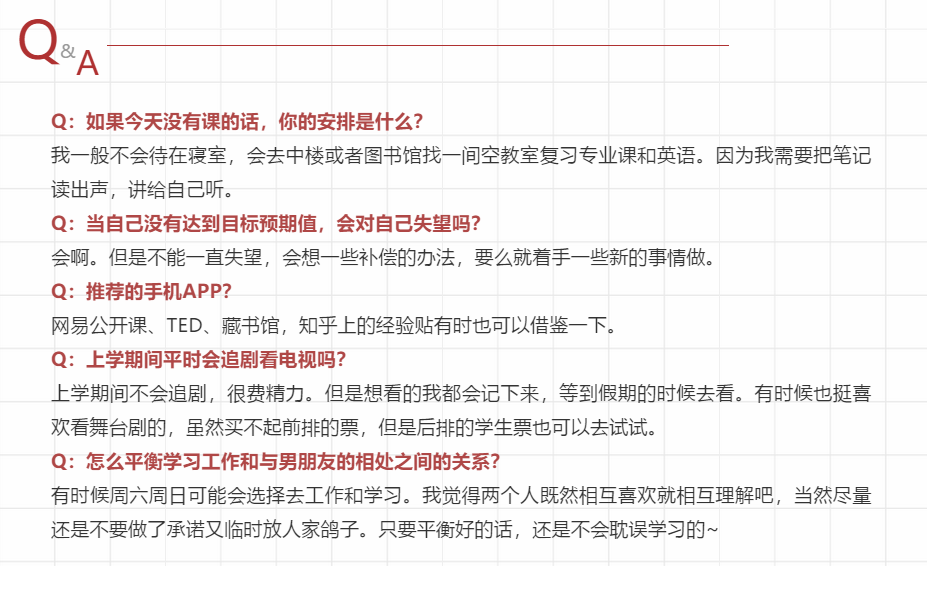 对杜子璇来说,获得各种奖项对她的心态其实没有太大的影响。她表示获奖后的一段时间可能会觉得自己有一点了不起,会有一点点浮躁,但是回家后或者休息一段时间其实她就完全忘了,好像自己从来没有得到过奖一样,没有什么感觉。说到这儿,她又想起了魏啸宇学长曾对她的嘱咐:“虽然你得过这么多奖项,但重要的是你能不能都把它们忘掉,从0开始,重新做东西。”