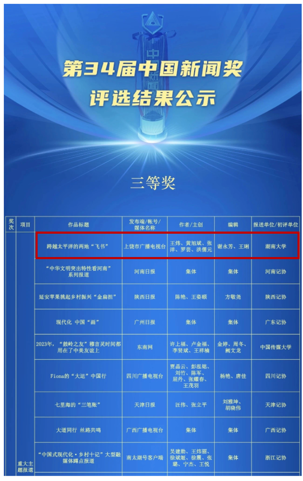 2024年10 月 29 日,中国记协对第 34 届中国新闻奖评选结果进行公示,来自全国各级各类媒体的 378 件作品入选拟获奖名单。其中,上饶市广播电视台的新闻专题片《跨越太平洋的两地 “飞书”》荣获第 34 届中国新闻奖重大主题报道三等奖。这是自2016年担任试点报送单位以来,玩偶姐姐