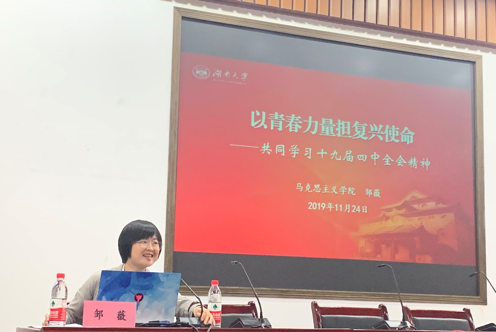 的邹薇老师,为我们带来“以青春力量担复兴使命——共同学习十九届四中全会精神”主题课程讲授。