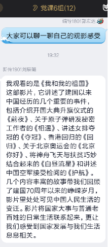 首先,大家对自己的观影感受展开热烈地讨论,《我和我的祖国》是大家最喜欢的红色电影,但大家最喜欢的部分不尽相同。缪佳佳同学提到她最喜欢《前夜》,敬佩在国家昌盛后那些默默付出的人们;彭章冰同学则谈了他的观影感受:看到祖国逐渐强盛,无法抑制内心的激动而热泪盈眶;刘辰璐同学说令她印象最深的是《回归》。