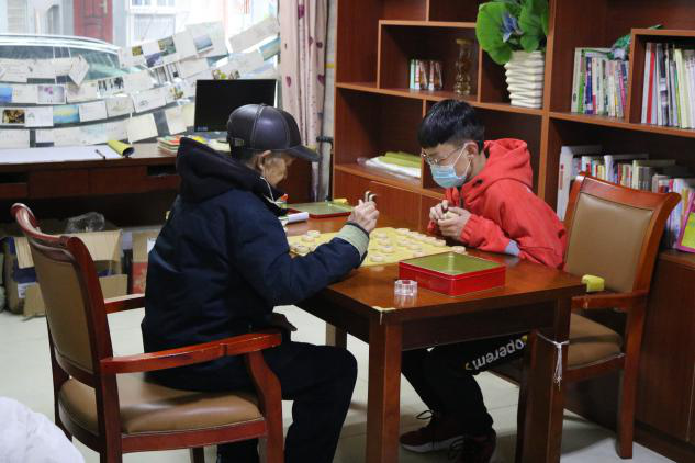 除了软陶泥的制作,志愿者们还陪老人们下象棋。伴随着手起手落,象棋在空中跳跃,再落在棋盘上,传来清脆的声响,和着笑声和叫好声,志愿者和老人度过了上午美好的时光。