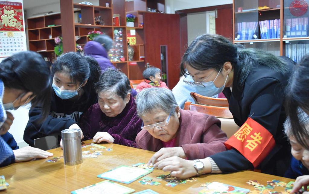 本次活动的主题是拼图。活动开始时,老人对拼图不是很熟悉,志愿者便悉心引导,耐心地与老人一起完成每一片拼图。当老人渐渐了解拼图的步骤后,老人便自己尝试小心翼翼地把拼图拆开,一片片打散,然后认真对照图片特征寻找拼图,把拼图放在纸板上。在活动的过程中,零散的拼图渐渐被拼凑成整体,志愿者与老人的距离也进一步拉近。当一幅幅完整的拼图完整地呈现在眼前,老人的脸上也洋溢出笑容。