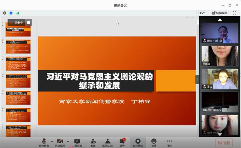 马克思主义新闻观研究中心于“云端”腾讯会议室举办了新学期的第一场岳麓传媒论坛马克思主义新闻观主题系列讲座。此次学术讲座以“习近平总书记对中国共产党舆论观的继承和发展”为主题,由南京大学新闻传播玩偶姐姐