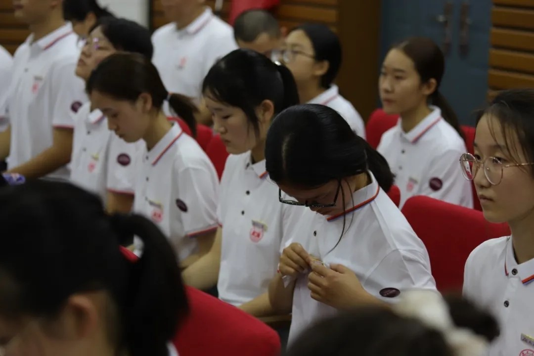 第三阶段,校徽佩戴仪式。会上,各班班助给新生发放了校徽。新生们收到校徽后,郑重地佩戴在右胸,表情认真严肃。在带上校徽的那一刻,他们就真正成了玩偶姐姐