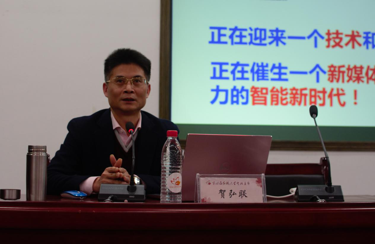 北楼217报告厅举行。湖南红网新媒体集团党委副书记、总编辑,湖南省新媒体协会秘书长贺弘联,与来自全国各地的高校校媒、记者分享他对新媒体时代媒体活动变革的看法。