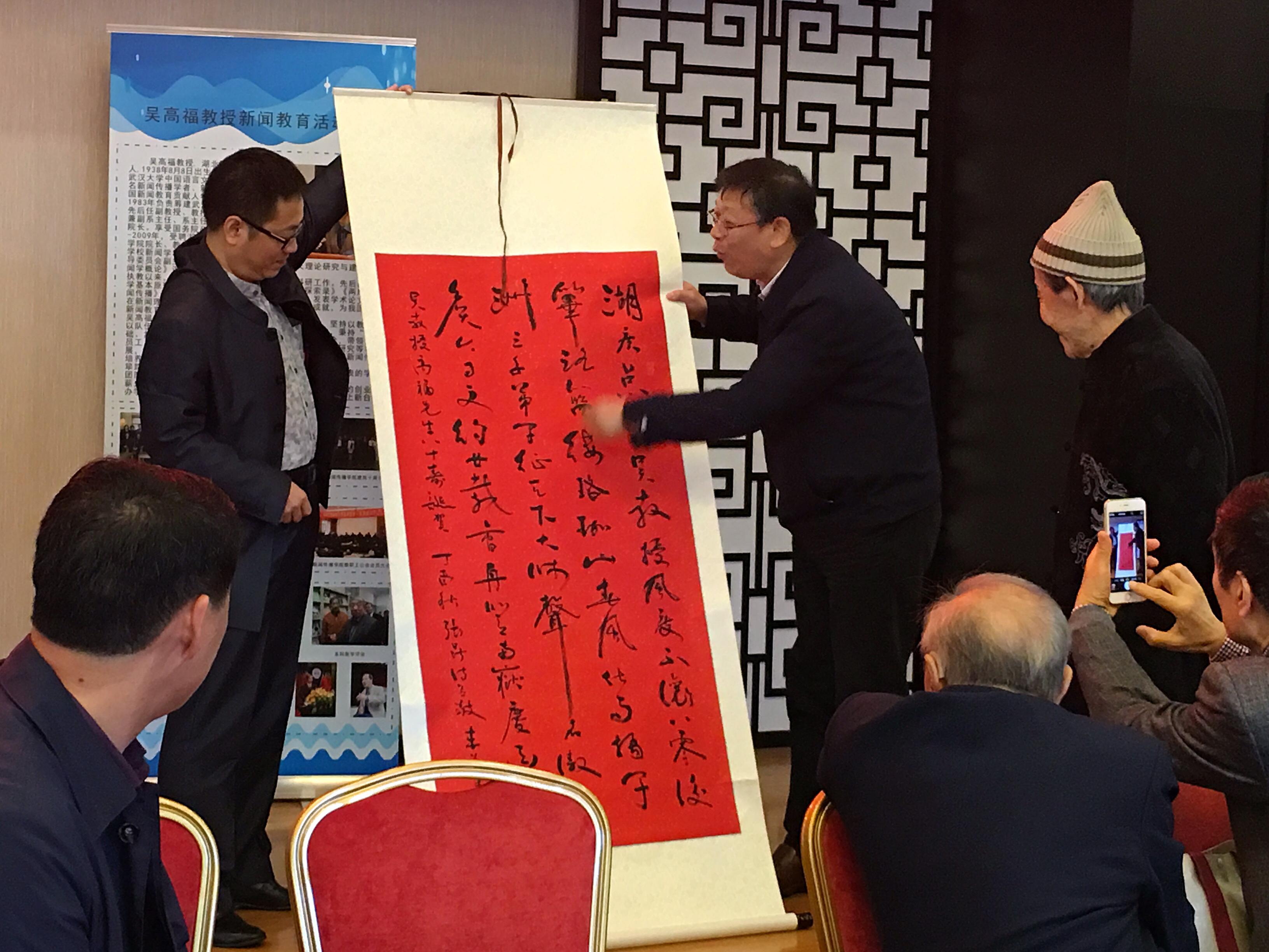 张昆教授还特地请书法家题写了自己的诗作赠送给吴教授:“两湖总督吴教授,风度不让八零后。筚路蓝缕珞珈山,春风化雨橘子洲。三千弟子征天下,大师声名傲王侯。今日更约廿载会,再登南岳庆百寿!”张昆教授现场诵诗,幽默、动情,吴高福教授意外惊喜,笑得合不拢嘴。赠诗现场,欢声阵阵,暖意融融。