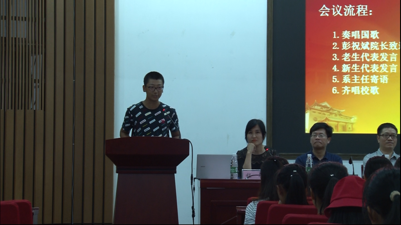 在奏唱国歌后,彭祝斌院长致欢迎辞,彭院长结合校史校情、同学们的实际,用生动的案例给“担当”这一词做了很好的诠释,鼓励同学们不辱“大学生”这一称号,不辱国家和人民赋予的使命,勇于担当。