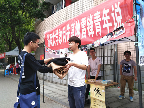 在募捐活动现场,也有很多感人瞬间。6日下午,来自工管院的冯易然同学义务过来帮忙,并加入了志愿者的队伍,整个下午一直跟着团队宣传,整理衣物,运送书籍。她说:“我已经大四了,虽然挺忙,但得知这个活动后还是来了。这样的捐助活动不仅使旧物得到换新,而且帮助到了所需要的人。真是意义非凡!”第二天中午下起了小雨,却仍有同学骑着单车撑着伞过来捐赠衣物。这些雨中忙碌的身影成为了一道道亮丽的青春风景线。