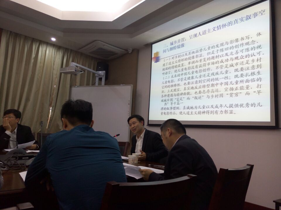 向志强副院长首先进行了简短的开场,之后三位老师就各自的选题进行了精彩的发言。何春耕教授阐述的主题是《新时期以来中国儿童电影叙事空间的变置与情感投射》。他从空间、情感投射、城乡并置三个方面分析了新时期以来中国儿童电影的特点和发展,并提出了儿童电影应城乡并置,打破常规,呈现人道主义情怀的真实叙事空间与独特镜像的观点。莫梅锋副教授的演讲题目是《青少年手机沉迷问题与对策研究》。在讲述自己的学术成果之前,他先向我们分析了此篇论文的研究缘由和“手机沉迷”一词的选词目的。然后从界定、表现、成因和预防四个方面对青少年手机沉迷问题进行了全面的分析,并反思了该研究在调查操作中存在的问题。在与会老师的热烈讨论中,向志强院长总结道:“问题不在于方法本身,而在于怎么使用它,方法上突破思想上也要突破。”黄学建副教授则探讨了保罗•索伦蒂诺导演“不背叛电影、契合新体验”的创作概念,并用该导演五部代表作为例,从叙事策略、人物形象、视听语言等层面进行论述,重点分析了第一部分。参与研讨会的老师也为黄学建副教授提出了修改意见并引申出关于大众文化的批判问题。黄学建副教授指出,因社会发育程度的不同,大众文化成为主导文化指使下的伪大众文化这一观点也得到了在座老师和同学们的认同。