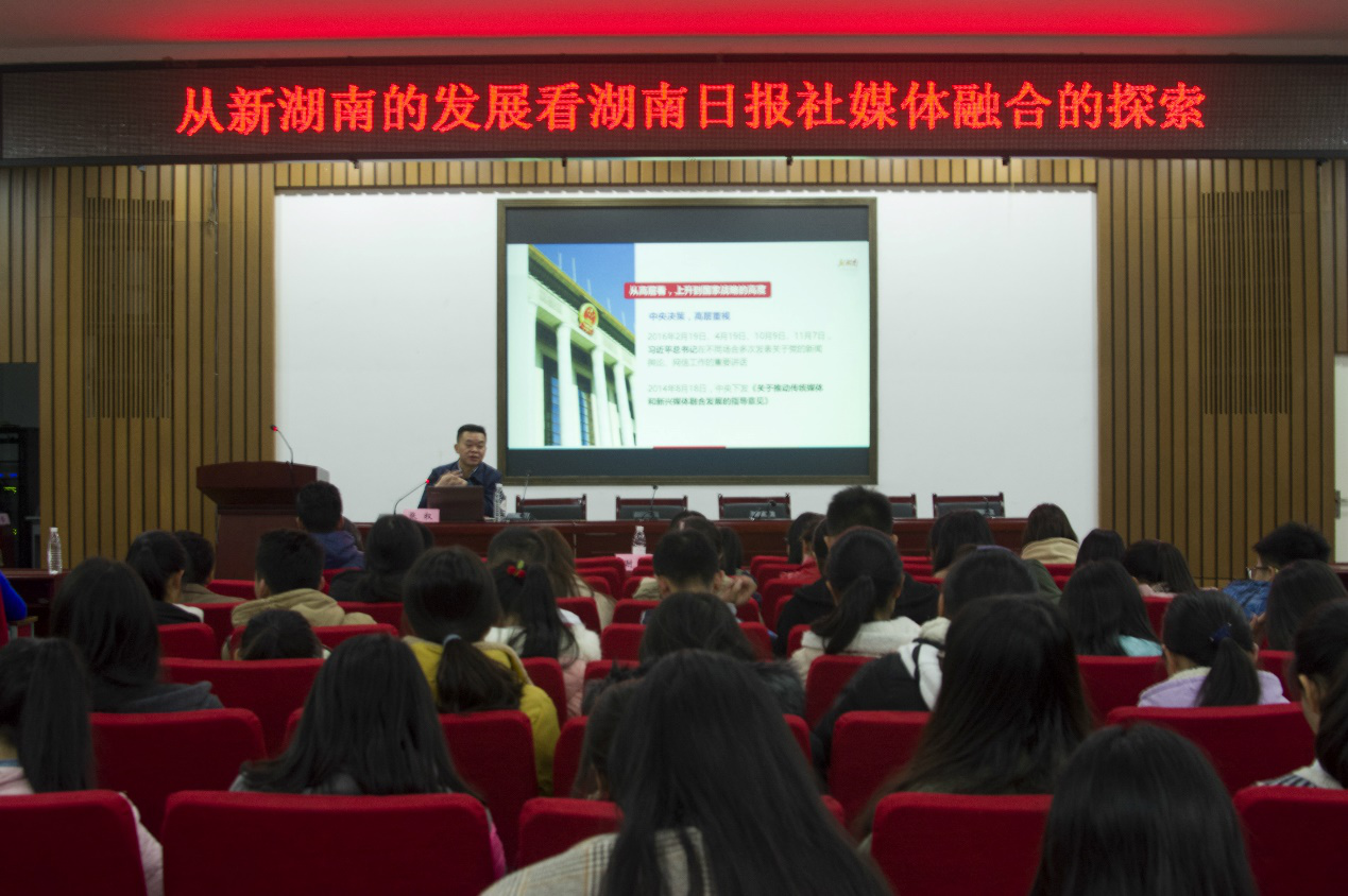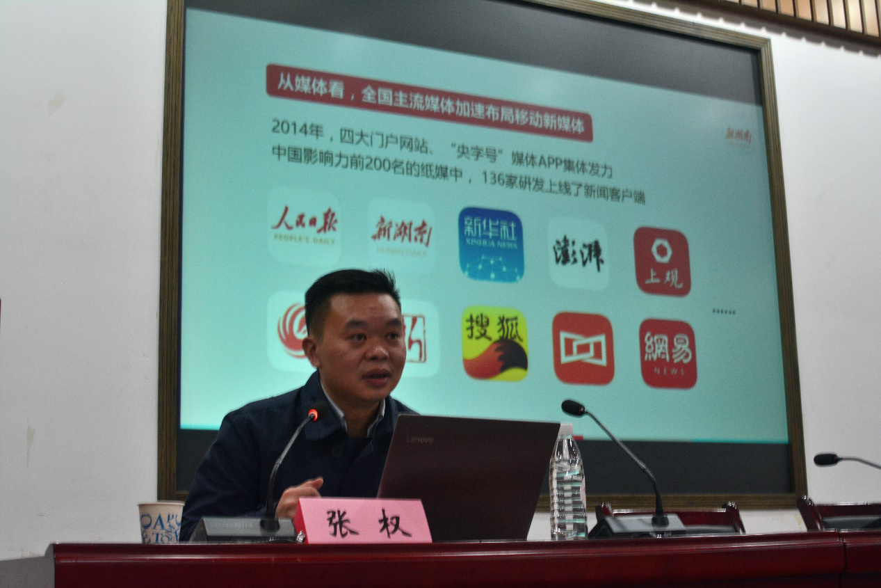 讲座以“从新湖南的发展看湖南日报社媒体融合的探索”为主题。张权主任从六大方面全面分析了应用移动新媒体技术的必然趋势,从移动咨询平台、移动政务平台和移动生活平台三方面系统地介绍了湖南日报社的新媒体平台——新湖南。在讲座过程中,张权主任引用了许多生动的案例,让同学们对新湖南有了更加直观的了解。